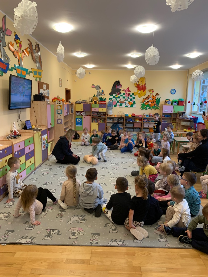 Wzieliśmy udział w spotkaniu warsztatowym z pracownikami Centrum Powiadamiania Ratunkowego. Dzieci miały okazję utrwalać wiedzę o właściwym zachowaniu w sytuacji trudnej, poznawały i utrwalały numery alarmowe a także miały okazję sprawdzić na fantomie jak wykonuje się masaż serca. Dzieci były bardzo zaangażowane i chętne do nauki.