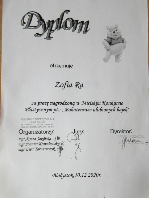 2. AMELIA B. z gr. IV i ANTONI Ch. z gr. II otrzymali nagrodę, a JULIA D. z grupy V i MAJA B. z gr. III wyróżnienie w miejskim konkursie plastycznym "Bohaterowie ulubionych bajek" zorganizowanym przez Przedszkole Samorządowe Nr 4