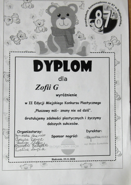 - Laura H.- z grupy V zajęła I miejsce; Hania S.,- II miejsce w konkursie plastyczno -technicznym, Livia- wyróźnienie : "Pluszowy miś dba o bezpieczeństwo i zdrowie" organizowanym przez Przedszkole Samorządowe Nr 87.