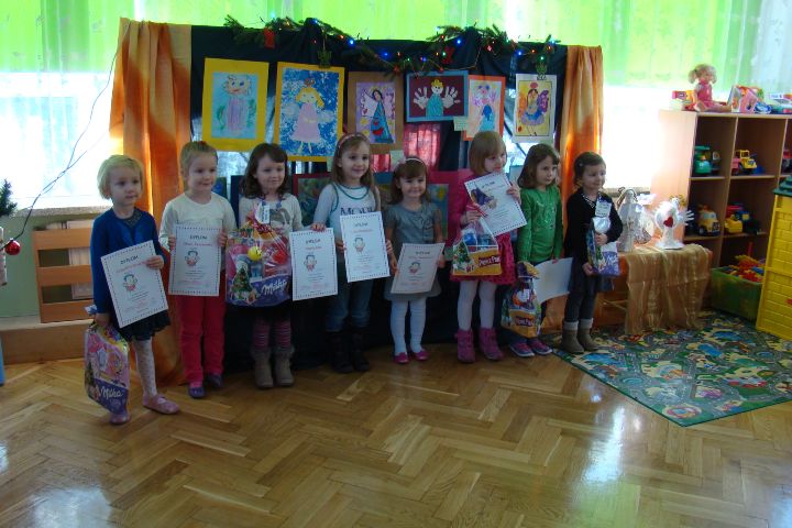 - Pola S.- nagroda, Zosia G., Zosia R., Lena F., - wyróżnienie, Jadzia D., Lena P. z grupy IV- prace zakwalifikowane na wernisaż w konkursie plastycznym Mikołajkowa Gala Przedszkolaków organizowanym przez MDK w Białymstoku.